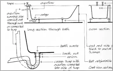 Get 2 free plumbing diagrams at: The image below illustrates s typical bathroom with multiple plumbing vents. Each fixture has a trap, which is a curved section of pipe. The actual layout of the fixtures will determine the design of the plumbing. Some pipes that are waste lines can be vent lines at the same time. Drill holes, cut pipes, and connect them in a dry run using drain fittings. Click here to get this free pdf file. The curved portion of the trap holds water in such a way that noxious gases cannot back up into the house. When toilet number one is flushed everything is fine. The y connector directs the water downward, eliminating direct flow into the opposite waste line. There's even a wet vent included that connects to the bathtub. Here are a few bathtub drain schematics and bathtub plumbing diagrams. The last step of connecting the sink, toilet, or tub is almost superfluous.